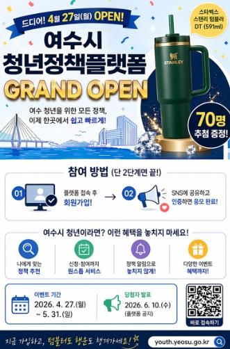 인사이드피플 노재현 기자 | 여수시는 청년들에게 맞춤형 정책 정보를 제공하고 양방향 소통을 지원하기 위한 ‘여수시 청년정책 플랫폼’을 27일 정식 운영 개시하고, 이를 기념한 특별 이벤트를 진행한다고 밝혔다.