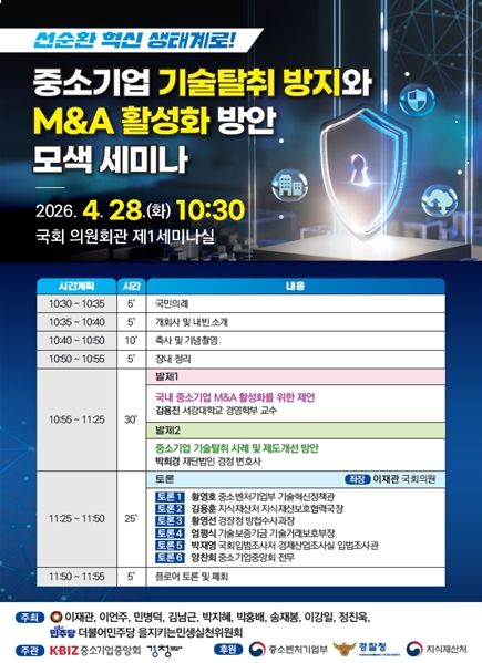 이에 이번 세미나는 중소기업의 기술탈취 사례와 M&A 활성화를 중심에 둔 만큼 김용진 서강대 경영학부 교수의 ‘국내 중소기업 M&A 활성화를 위한 제언’과 박희경 재단법인 경청 변호사의 ‘중소기업 기술탈취 사례 및 제도개선 방안’으로 발제가 이루어질 예정이다.