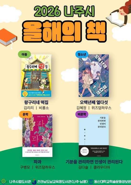 2026년 나주시 올해의 책으로 최종 선정된 도서는 어린이 분야 ‘왕구리네 떡집’(김리리), 청소년 분야 ‘오백년째 열다섯’(김혜정), 일반문학 분야 ‘파과’(구병모), 일반 비문학 분야 ‘기분을 관리하면 인생이 관리된다’(김다슬)이다.