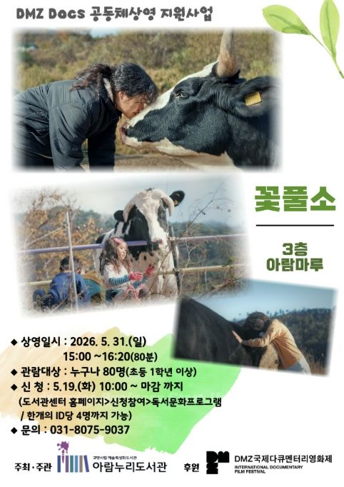 인사이드피플 강애자 기자 | 고양특례시 아람누리도서관은 DMZ국제다큐멘터리영화제와 협업해 오는 5월 31일 오후 3시, 도서관 3층 아람마루에서 다큐멘터리 영화 ‘꽃풀소’ 상영회를 개최한다.
