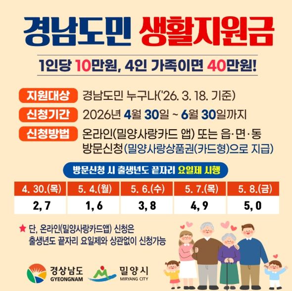 인사이드피플 심정보 기자 | 경남 밀양시는 오는 4월 30일부터 시민 생활 안정을 지원하기 위한 ‘경남도민 생활지원금’ 신청을 받는다고 밝혔다.