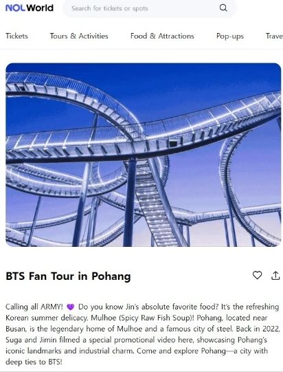 시는 27일부터 NOL World 홈페이지 및 모바일 애플리케이션 메인 배너를 통해 포항 관광을 주제로 한 특집 매거진을 노출하고, BTS 콘서트 예매자를 포함한 전체 가입자를 대상으로 포항 관광상품 홍보 메일을 발송할 예정이다.