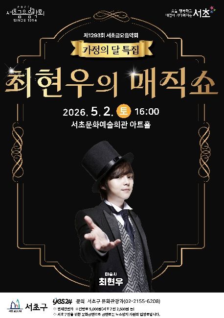 인사이드피플 강애자 기자 | 서울 서초구가 가정의 달 5월을 맞아 오는 5월 2일 토요일 오후 4시, 서초문화예술회관 아트홀에서 서초토요콘서트 '최현우의 매직쇼'를 개최한다고 밝혔다.