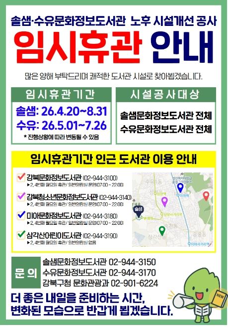 먼저 솔샘문화정보도서관은 지난 4월 20일부터 8월 31일까지 약 4개월간, 수유문화정보도서관은 5월 1일부터 7월 26일까지 약 3개월간 임시 휴관한다. 공사 기간 동안 두 도서관의 자료실과 열람실 등 모든 시설 이용은 전면 중단된다.