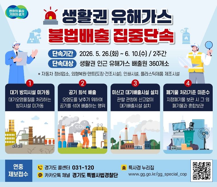 인사이드피플 노재현 기자 | 경기도 특별사법경찰단이 5월 26일부터 6월 10일까지 2주간 주거지·학교·병원 등 생활권 인근 지역의 유해가스 배출 사업장을 대상으로 불법행위를 집중단속 한다.