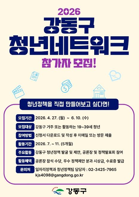 인사이드피플 노재현 기자 | 서울 강동구는 ‘2026년 강동구 청년네트워크’ 참여자를 모집한다고 밝혔다. 청년네트워크는 청년들이 직접 의제를 발굴하고 정책을 제안하는 사업이다.