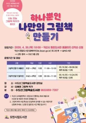 익산시 수도산그림책숲도서관은 오는 5월 16일부터 초등학생을 대상으로 '하나뿐인 나만의 그림책 만들기' 수업을 운영한다.