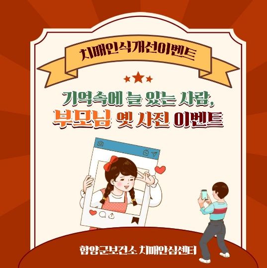 인사이드피플 장은미 기자 | 함양군 치매안심센터는 5월 가정의 달을 맞아 부모님의 옛 추억이 담긴 사진을 통해 감사의 마음을 전하고, 치매 예방의 중요성을 알리기 위해 ‘부모님 옛 사진 인증샷 이벤트’를 비대면으로 운영한다고 밝혔다.