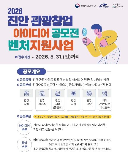 인사이드피플 노재현 기자 | (사)진안군관광협의회(이사장 이재동)가 지역 관광자원을 활용한 창의적인 아이디어를 발굴하고 실질적인 사업화를 지원하기 위해 ‘2026 진안 관광창업 아이디어 공모전’을 개최한다.