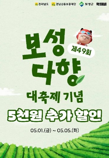 이용자는 ▲기본 할인 5천 원 ▲다향대축제 특별 할인 5천 원 ▲전라남도 배달비 지원 3천 원을 더해 최대 1만 3천 원의 할인 혜택을 받을 수 있다.