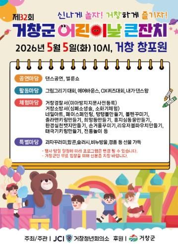 이번 행사는 거창청년회의소가 주관하며, 오전 10시부터 오후 3시까지 다채롭고 풍성한 프로그램으로 어린이와 가족 모두에게 특별한 하루를 선사할 예정이다.