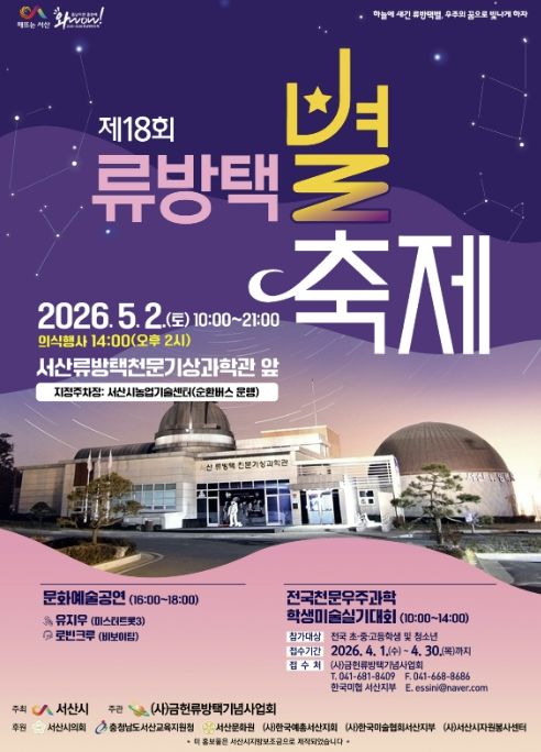 인사이드피플 강애자 기자 | 충남 서산시는 오는 5월 2일 류방택천문기상과학관 일원에서 제18회 류방택 별축제를 개최한다고 밝혔다.