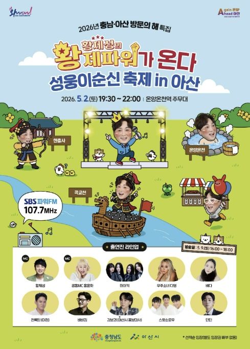 인사이드피플 노재현 기자 | 인기 라디오 프로그램 SBS 파워FM ‘황제성의 황제파워’ 공개방송이 5월 2일 ‘제65회 아산 성웅 이순신축제’ 현장에서 열린다. 아산에서 라디오 공개방송이 열리는 것은 2013년 ‘대한민국 아산 온천대축제’ 이후 13년 만이다.