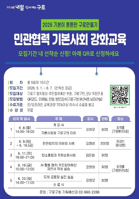 대상은 협치회의·주민참여예산위원을 비롯해 관내 직장인 및 구정에 관심 있는 구민 누구나 참여할 수 있다. 오는 6월 8일부터 6월 23일까지 총 5회차, 10시간 과정으로 진행되며, 온·오프라인 교육을 병행해 운영된다.