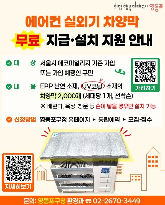 인사이드피플 노재현 기자 | 영등포구가 다가오는 여름철 무더위에 대비해 구민들의 냉방비 부담을 줄이고 에너지 효율을 높이기 위한 ‘에어컨 실외기 차양막 설치 지원사업’을 추진한다고 밝혔다.