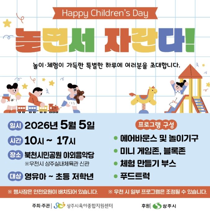 인사이드피플 강애자 기자 | 상주시는 제104회 어린이날을 맞아 오는 5월 5일 북천시민공원 야외음악당에서 ‘Happy Children`s Day – 놀면서 자란다!’를 주제로 어린이날 기념행사를 개최한다.