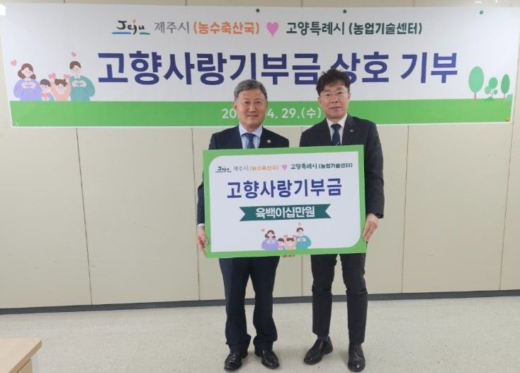 인사이드피플 노재현 기자 | 제주시는 4월 29일 고양특례시 농업기술센터에서 고양특례시와 고향사랑기부금 상호 전달식을 갖고 지역 간 상생과 협력 강화에 뜻을 모았다.