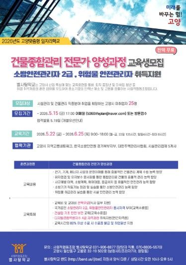 인사이드피플 이현진 기자 | 고양특례시는 중장년과 청년 미취업자의 재취업을 지원하는 2026년 고양맞춤형 일자리학교의 일환으로, ‘건물종합관리 전문가 양성과정’에 참여할 교육생을 모집한다고 29일 밝혔다.