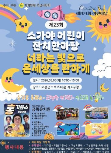 공정민 고성사랑회 회장은 “고성사랑회가 22년 넘게 어린이날 행사를 추진해 온 경험을 바탕으로 이번 행사도 아이들이 마음껏 뛰어놀 수 있도록 다채롭고 볼거리 많은 프로그램으로 준비했다”며 “많은 가족이 찾아와 행복한 시간을 보내길 바란다”고 밝혔다.
