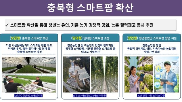 김영환 충북도지사는 “스마트팜은 청년에게는 새로운 기회를, 기존 농업인에게는 경쟁력을, 농촌에는 활력을 더하는 미래농업의 핵심 전략”이라며, “앞으로도 임대형·보급형·창업형 등 충북형 스마트농업 확산정책을 속도감 있게 추진하겠다”고 말했다.
