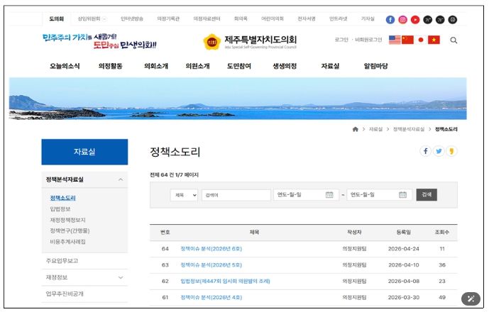 인사이드피플 김재윤 기자 | 제주특별자치도의회는 입법 및 정책 동향 등 주요 현안에 대한 최신 정보를 도민에게 신속히 제공하기 위하여 '정책 소도리'를 운영하고 있다고 밝혔다.