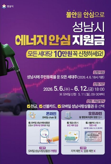 지원 대상은 2026년 4월 6일 18시 기준 성남시에 주민등록을 둔 세대주 410,218명이며, 세대당 10만원이 지급된다. 지급 방식은 현금(계좌이체), 선불카드, 성남사랑상품권(모바일) 중 선택할 수 있도록 해 시민 선택권을 보장했다.