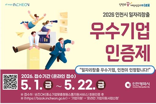 인사이드피플 심정보 기자 | 인천광역시는 고용 창출뿐만 아니라 근로환경 개선까지 종합적으로 평가하는 ‘2026년 일자리창출 우수기업 인증제’를 시행한다고 밝혔다.