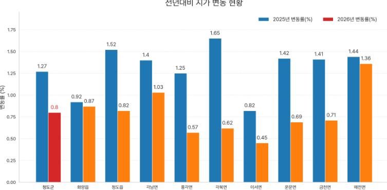 이 가운데 군 평균 변동률을 웃도는 지역은 4곳으로 매전면(1.36%), 각남면(1.03%), 화양읍(0.87%), 청도읍(0.82%) 순으로 나타났다.