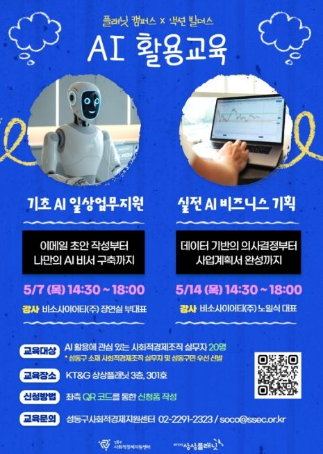 인사이드피플 노재현 기자 | 서울 성동구 사회적경제지원센터는 사회적경제조직 실무자의 디지털 전환 대응과 업무 효율성 향상을 위해 ‘플래닛 캠퍼스×액션 빌더스 'AI 활용 교육'’을 오는 5월 7일, 14일 총 2회에 걸쳐 KT&G 상상플래닛 3층 스케일업룸(301호)에서 운영한다고 밝혔다.