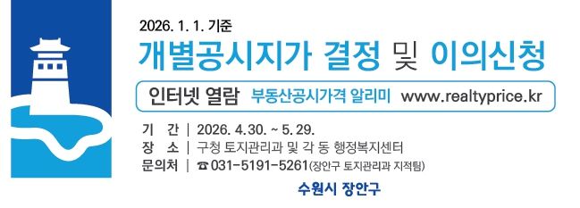 인사이드피플 노재현 기자 | 수원시 장안구는 2026년 1월 1일 기준 장안구 관내 26,934필지에 대한 개별공시지가를 4월 30일에 결정·공시하고, 다음 달 29일까지 이의신청 접수를 받는다고 밝혔다.