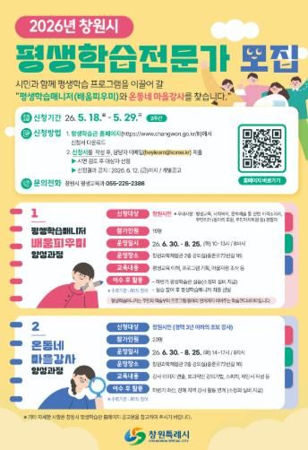 인사이드피플 노재현 기자 | 창원특례시는 시민이 주도하는 평생학습 환경 조성을 위해 ‘2026년 창원시 평생학습전문가 양성과정’을 운영하고, 평생학습매니저 ‘배움피우미’와 온동네 마을강사를 공개 모집한다고 밝혔다.