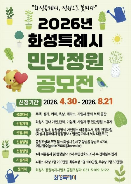 참여를 희망하는 시민은 오는 4월 30일부터 8월 21일까지 신청서와 정원 전경 사진 등을 갖추어 화성특례시 공원녹지사업소 공원조성과로 우편(화성시 만세구 향남읍 향남로 470) 접수하거나 이메일로 제출하면 된다.