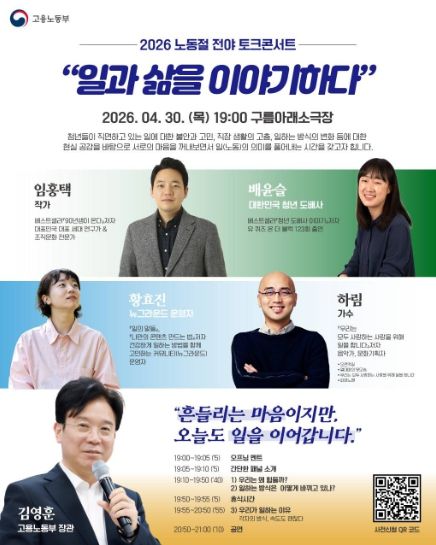 인사이드피플 노재현 기자 | 고용노동부는 4월 30일 저녁 7시, 서울 마포구 소재 ‘구름아래소극장’에서 청년 200여 명과 함께 일에 대한 고민을 나누며, 노동의 가치를 다시 한번 생각해 보는'일과 삶을 이야기하다' 토크콘서트를 개최했다고 밝혔다.