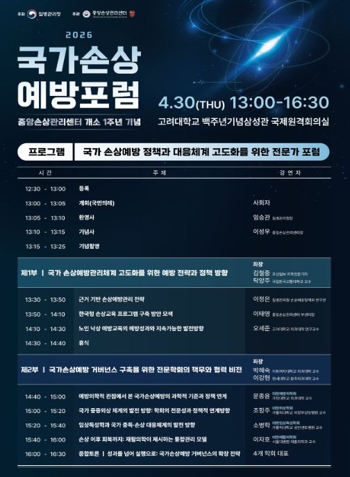 인사이드피플 장은미 기자 | 질병관리청은 중앙손상관리센터 개소 1주년을 맞아 4월 30일 고려대학교 백주년기념삼성관에서 「2026년 국가손상예방포럼」을 개최한다.