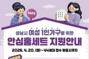 인사이드피플 노재현 기자 | 성남시는 여성 1인 가구의 범죄예방과 안전한 주거생활을 위해 ‘안심 홈세트 3종’을 지원한다고 16일 밝혔다. 지원 품목은 스마트 도어벨, 홈캠, 문열림 센서다. 대상은 성남시에 사는 여성 1인 가구 또는 한부모(모자, 부녀)가족이면서 전월세 보증금 3억원 이하의 다가구·다세대 주택 거주자다. 지원 물량은 44가구다. 시는 신청자의 자격요건 확인 뒤 대상 가구에 안심 홈세트를 선착순으로 지원한다. 희망자는 오는 4월 20일부터 성남시 홈페이지(시정소식→새소식) 또는 경기민원24 홈페이지(여성 1인가구 안심패키지 지원사업)를 통해 신청서와 임대차계약서 사본을 첨부해 보내면 된다. 시청 6층 여성가족과를 방문 접수하거나 담당자 이메일로 해당 서류를 보내도 된다. 성남지역 1인 가구 수는 3월 말 기준 전체 41만325가구의 39%인 16만661가구다. 이 중 여성 1인 가구는 48%인 7만7845가구다. 성남시는 2021년도부터 이 사업을 펴 지난해까지 5년간 576가구에 안심 홈세트를 지원했다.
