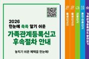 인사이드피플 노재현 기자 | 속초시는 가족관계등록신고 이후 필요한 각종 후속 행정절차를 시민들이 보다 쉽고 편리하게 이해하고 이행할 수 있도록 가족관계등록신고 후속절차 안내 리플릿을 제작해 시청 종합민원실과 8개 동 주민센터에 배포한다. 이번 리플릿은 출생·혼인·사망 신고 이후 수반되는 다양한 행정절차를 한눈에 확인할 수 있도록 구성해 시민들이 관련 절차를 놓치지 않고 적기에 이행할 수 있도록 돕기 위해 마련됐다. 리플릿에는 출생 신고 후 첫만남이용권, 부모급여, 양육수당·아동수당, 출산장려금, 출산 축하 물품 지원 등과 혼인·이혼 신고 후 전입신고, 한부모가정 지원 서비스, 사망 신고 후 상속과 금융 관련 절차 등 유형별 주요 후속 절차가 신청 방법과 문의처와 함께 체계적으로 담겼다. 또 QR코드를 함께 수록해 스마트폰으로도 관련 정보를 신속하고 편리하게 확인할 수 있도록 접근성과 활용도를 높였다. 속초시 관계자는 “이번 안내 리플릿이 가족관계등록신고 이후 필요한 절차에 대한 시민 이해를 높이고 민원 처리 과정의 불편을 줄이는 데 도움이 되길 기대한다”며 “앞으로도 시민 중심의 생활밀착형 행정서비