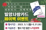 인사이드피플 박미영 기자 | 밀양시는 ‘2023 밀양 방문의 해’를 맞이해 지역경제 회복을 유도하고 지역 내 소비 촉진을 위하여 ‘밀양사랑카드 소비촉진 페이백 이벤트’를 실시한다. 이번 이벤트는 가족의 사랑과 화목을 나누는 가정의 달이며 제65회 밀양아리랑대축제가 있는 5월을 맞이해 2023년 대한민국 동행축제와 함께 추진된다. 지역 경제회복을 유도하고 지역 내 소비 촉진을 위해 밀양시 소상공인연합회(회장 신영철) 주관으로 실시하며 600여 명의 참여자에게 혜택이 돌아간다. 이벤트 참여는 5월 1일부터 5월 31일까지 밀양사랑카드를 사용하여 결제한 금액이 50만원 이상일 경우 자동 응모되어, 추첨을 통해 3만원(100명), 2만원(200명), 1만원(300명)을 6월 14일 일괄 지급할 예정이다. 밀양사랑카드는 지역경제 활성화를 위해 밀양시에서 발행하는 충전식 선불카드 형태의 지역 화폐로 1인당 월 50만 한도 내에서 충전 시 10% 인센티브를 부여하고 전통시장 40%, 일반점포 30%의 소득공제 혜택을 제공한다. 발급은 밀양사랑카드 앱을 이용해 직접 발급받거나, 경남은행, 산림조합, 신협, 새마을금고, 축협, 농협 등 49개 금융기관에서