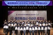 인사이드피플 강애자 기자 | 용인특례시는 30일 시청 에이스홀에서 ‘제72회 경기도체육대회 2026 광주’에 참가하는 선수단 출정식을 개최했다. 제72회 경기도체육대회는 4월 16일부터 18일까지 3일간 광주시 일원에서 열리며, 용인특례시는 육상, 축구, 태권도 등 26개 종목에 선수 312명이 출전한다. 출정식에는 이상일 시장을 비롯해 체육회 임원과 종목단체장, 선수단 등 약 300명이 참석했다. 이상일 시장은 격려사를 통해 “그동안 대회를 위해 열심히 준비해 온 선수단 여러분들 정말 자랑스럽다”며 “이번 대회에서 갈고닦은 실력을 마음껏 발휘해 원하는 성과 거두시길 바라고, 모두가 한 단계 더 성장하는 계기가 되길 바란다”고 말했다. 이 시장은 “선수들이 더 좋은 환경에서 훈련하고 기량을 펼칠 수 있도록 지원을 확대하기 위해 노력하고 있다”며 “앞으로도 여러분과 함께 힘과 지혜를 모아 오늘보다 더 나은 내일을 만들어가겠다”고 했다. 이 시장은 출정식 이후 집무실에서 직장운동경기부 감독과 종목단체 회장단을 대상으로 간담회를 열어 선수단을 격려하고, 현장의 애로사항과 건의사항을 청취했다.