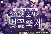 인사이드피플 강애자 기자 | 오산문화재단은 오는 4월 3일 오후 6시 30분 오산천 야외무대(종합운동장 뒤편)에서 시민들과 함께하는 봄맞이 ‘2026 오산천 벚꽃 축제’를 개최한다. 이번 행사는 따뜻한 봄의 시작을 알리며 시민들에게 특별한 추억을 선사하기 위해 마련된 것으로, 가수 황민호의 축하 공연을 비롯해 점등식과 폭죽 퍼포먼스가 어우러져 오산천 일대를 화려한 봄밤의 분위기로 물들일 예정이다. 행사 당일에는 음악과 빛, 불꽃이 조화를 이루는 다양한 프로그램이 진행되며, 남녀노소 누구나 함께 즐길 수 있는 열린 문화행사로 시민들의 큰 호응이 기대된다. 오산문화재단 관계자는 “오산천에서 펼쳐지는 이번 축제가 시민들에게 특별한 봄밤의 추억으로 남길 바란다”며 “앞으로도 시민들이 일상 가까이에서 문화와 예술을 향유할 수 있도록 다양한 프로그램을 지속적으로 마련하겠다”고 밝혔다.