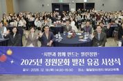 인사이드피플 강애자 기자 | 수원특례시는 18일 팔달문화센터 예당마루홀에서 ‘2025년 정원문화 발전 유공 시상식’을 열었다. 정원문화 발전에 기여한 시민과 단체 등에 수원시장상(47개)과 수원시의회 의장상(7개)을 수여했다. 시상은 표창장·감사패 수여, 시민정원 경연대회, 베스트 관리상, 올해의 정원인상 등 분야별로 진행됐다. 지난 10월 효원공원에서 열렸던 ‘2025년 수원시 시민정원 경연대회’ 수상팀들을 시상했다. 하나의 물방울이 만들어내는 무한한 생명의 파장을 표현한 ‘완뚝원정대’의 ‘리플(ripple) 가든’이 대상을 받았다. 어린 꽃이 꿈꾸는 산의 이미지를 담은 ‘진달래동산 꽃뫼’ 팀의 ‘어린 꽃이 꿈꾸는 뫼(산)’이 최우수상, 빛과 생명의 흐름을 표현한 ‘빛나게’ 팀의 ‘Flowing Light, Flowering Life(플로잉 라이트, 플라워링 라이프’가 우수상을 받았다. 이재준 수원시장은 “도심 속 열린 정원은 시민에게 휴식처가 되고, 기후 위기 대응에는 힘이 된다”며 “정원을 가꾼 수상자 노력에 감사하며 시민 일상에 초록이 늘도록 지원을 이어가겠다”고 말했다.